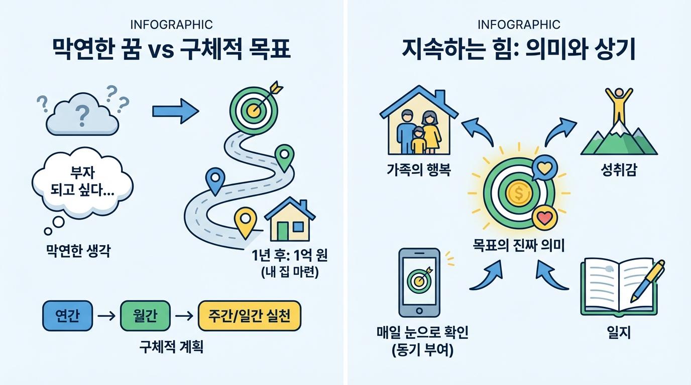 많은 분들이 경제적 자유, 즉 ‘부자가 되고 싶다’는 꿈을 마음속에 품고 계실 것입니다. 하지만 막상 어떻게 그 꿈을 현실로 만들지, 어떤 목표를 세워야 할지에 대해서는 명확한 답을 찾기 어려워 하시죠. 그저 막연히 ‘언젠가는 부자가 되겠지’라는 생각만으로는 현실의 변화를 기대하기 어렵습니다. 이 글을 통해 여러분의 소중한 꿈을 현실로 이끌어 줄 목표 설정 방법과 그것을 실현하는 구체적인 단계를 함께 살펴보겠습니다.
