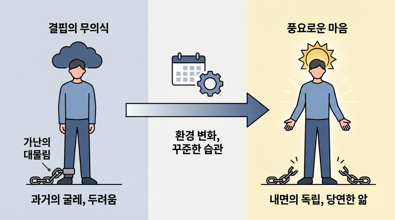 또한, 부모로부터 물려받은 정서적 유산, 특히 결핍의 무의식은 생각보다 강력하게 우리의 발목을 잡습니다. 부모님이 자식에게 습관적으로 하는 "미안하다"는 말은 아이의 무의식에 부채감과 결핍을 심어줄 수 있습니다. 진정한 부의 길로 들어서기 위해서는 물질적, 경제적 독립을 넘어 관계적, 그리고 무의식적 독립을 이뤄내야 합니다. 부모의 삶과 나를 분리하고, 스스로를 온전한 주체로 규정할 때 비로소 가난의 대물림을 끊을 수 있습니다.