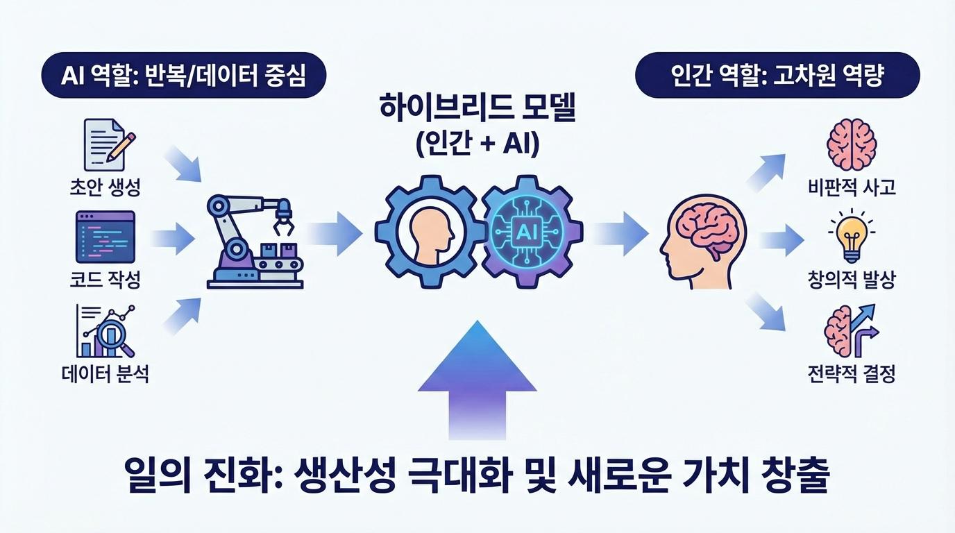 미래의 업무 환경은 인간 혹은 AI, 둘 중 하나를 선택하는 제로섬 게임이 아닐 것입니다. 오히려 인간의 직관과 경험에 AI의 막강한 데이터 처리 능력이 결합된 ‘하이브리드’ 모델이 새로운 표준으로 자리 잡을 것입니다. AI는 인간의 능력을 보조하고 증강시키는 강력한 도구이자, 생산성을 극대화하는 최고의 파트너가 될 수 있습니다.