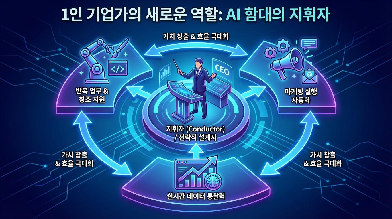 오늘날 1인 기업 CEO의 아침은 더 이상 산더미처럼 쌓인 이메일이나 단순 반복 업무와의 사투로 시작되지 않습니다. 대신 그들은 지휘자의 관점에서 밤사이 인공지능 군단이 수행한 작전 결과를 검토하며 하루를 엽니다. 이는 단순한 자동화를 넘어선 지능적 위임의 실현이며, 인간의 노동이 육체적 근면함에서 전략적 통찰로 이동했음을 상징하는 가장 강력한 신호입니다.