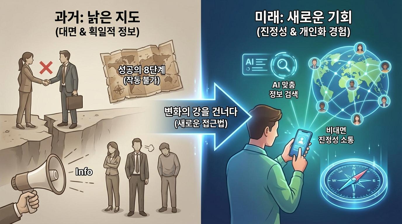과거의 상처보다 더 근본적인 위기는 바로 '바뀐 세상' 그 자체입니다. 코로나 팬데믹은 인간관계의 방식을 근본적으로 바꾸어 놓았습니다. 직접 만나서 정보를 공유하고 신뢰를 쌓던 전통적인 방식은 물리적 거리 두기로 인해 큰 타격을 입었습니다. 사람들은 더 이상 불필요한 대면 접촉을 꺼리게 되었고, 정보 습득 방식 역시 온라인과 비대면 채널로 급격히 전환되었습니다.